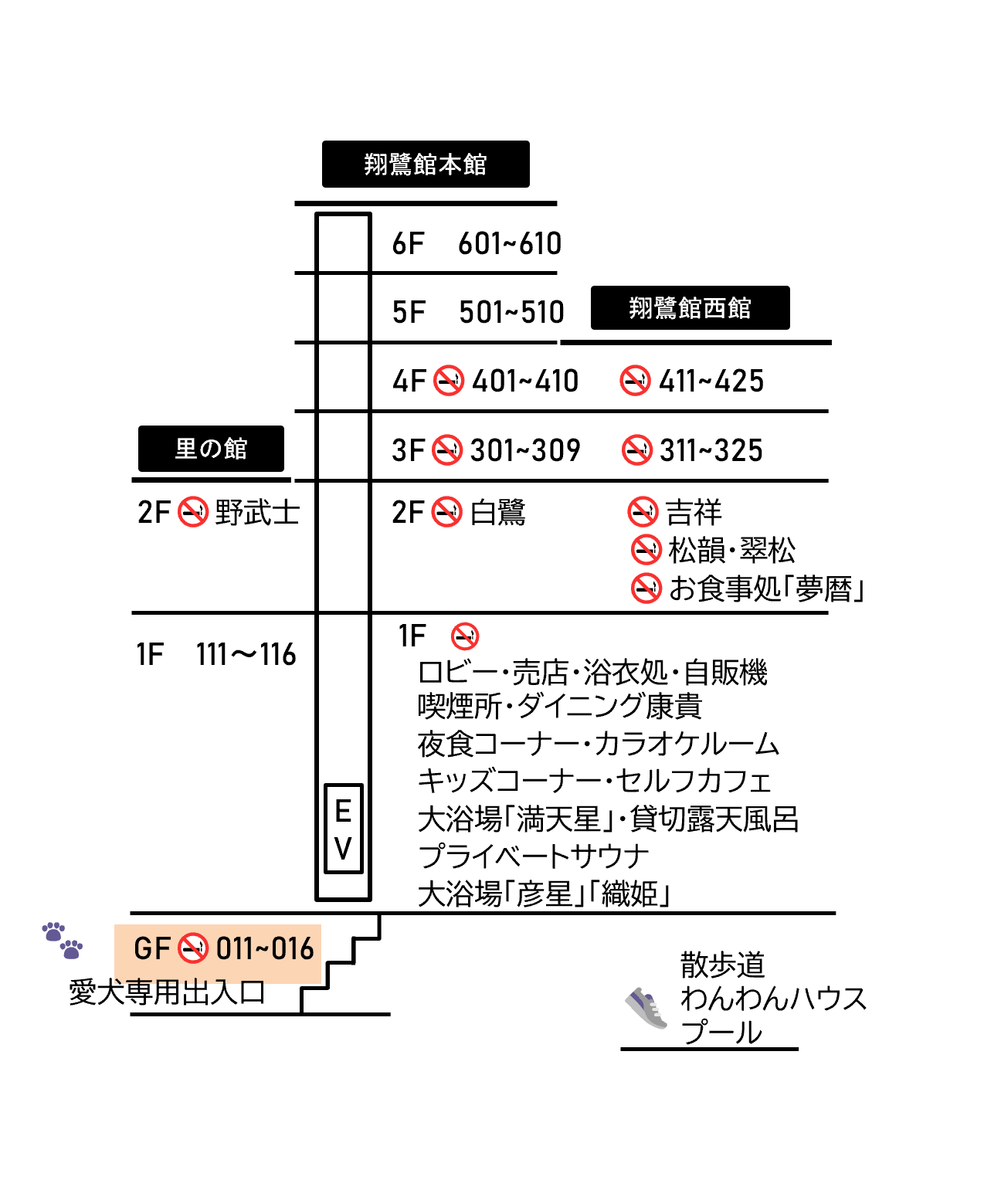 設備 冷蔵庫・温水洗浄トイレ・テレビ・電話・湯沸かしポット・金庫・内風呂・Wifi完備 アメニティ シャンプー・ボディソープ・化粧水・タオル・バスタオル・歯磨きセット・ヘアブラシ・浴衣・スリッパ・雪駄 【女性】コットン・シャワーキャップ 広さ・定員 48㎡~52㎡・定員5名 備考 【喫煙可】<禁煙> |