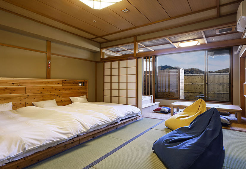 各フロアに1室ずつある角部屋に、里山の田園風景を独り占めできるビューバスを設えました お部屋は、南向きに広がる景色を楽しめるようくつろぎの家具を配置し ※3名以上でご利用の場合は、予めお布団を敷かせていただきます。 |